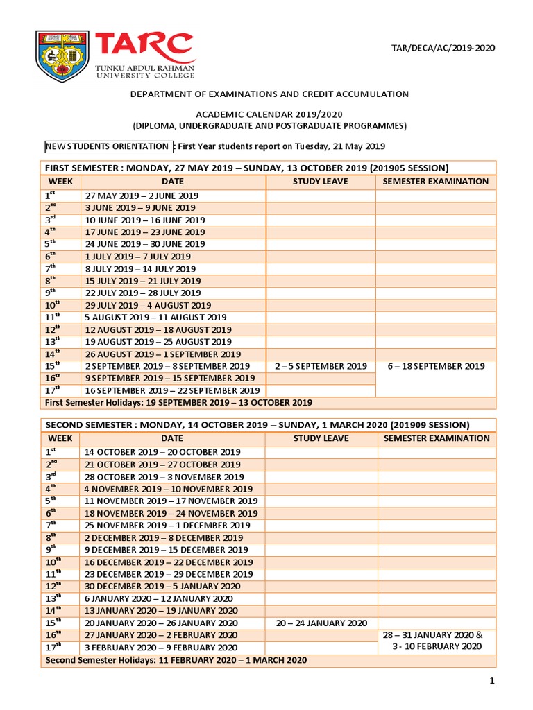 Tarc 2019 Time Table Academic Term Postgraduate Education