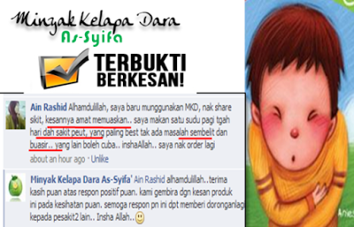 Produk ini minyak kelapa dara ini diproses dengan tanpa menggunakan haba ataupun kimia dan minyak kelapa dara menyimpan berbagai khasiat yang sangat diperlukan. Mengurangkan masalah morning sickness. Ditenagakan dengan bacaan 30 juzuk al quran dan ayat syifa doa penyembuh penyakit secara langsung oleh anak anak tahfiz dari pondok tahfiz moden saadah addarain bukan kaset cd radio.