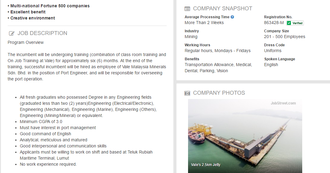 Oil Gas Vacancies Port Engineer Program Vale Malaysia Minerals Sdn Bhd Perak